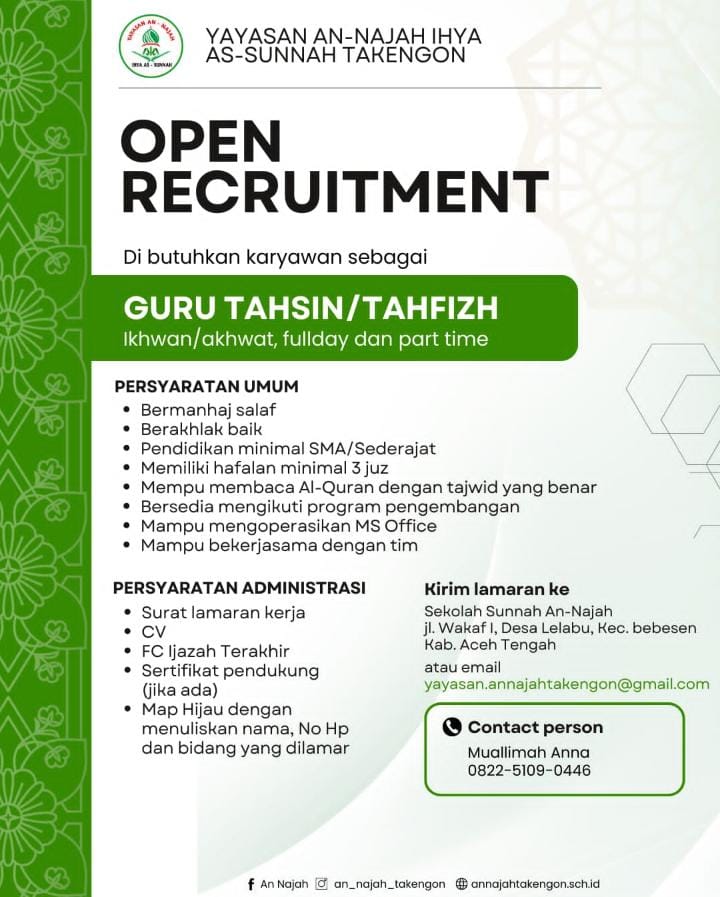Yayasan An-Najah Ihya As-Sunnah Takengon membuka kesempatan bagi ikhwan dan akhwat untuk bergabung sebagai Guru Tahsin/Tahfizh (fullday & part time).
